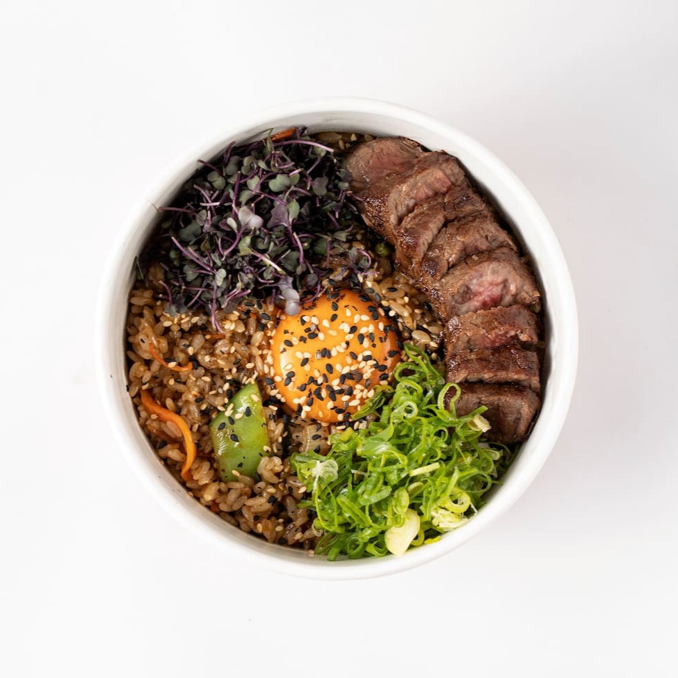 Carne de Wagyu puro (150g) cortada em finas laminas, marinada (marinada levemente adocicada) e finalizada na Wok com cenoura Julienne. Acompanha Gohan e gema curada. Obs: gema vem a parte