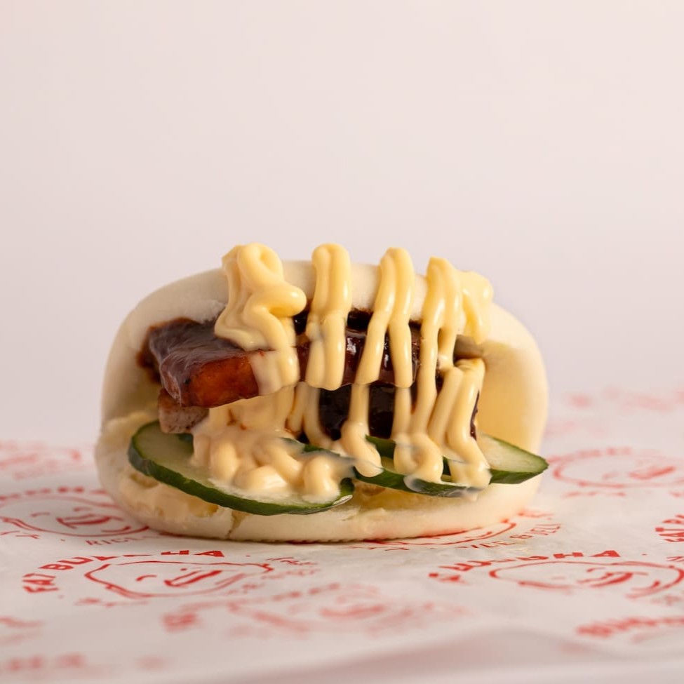 Bao macio e fofinho, com nossa Pancetta de longo cozimento ao molho Hoisin (tipo um barbecue asiatico) feito na casa, finalizando com fatias de pepino e maionese Kewpie! 2 unidades