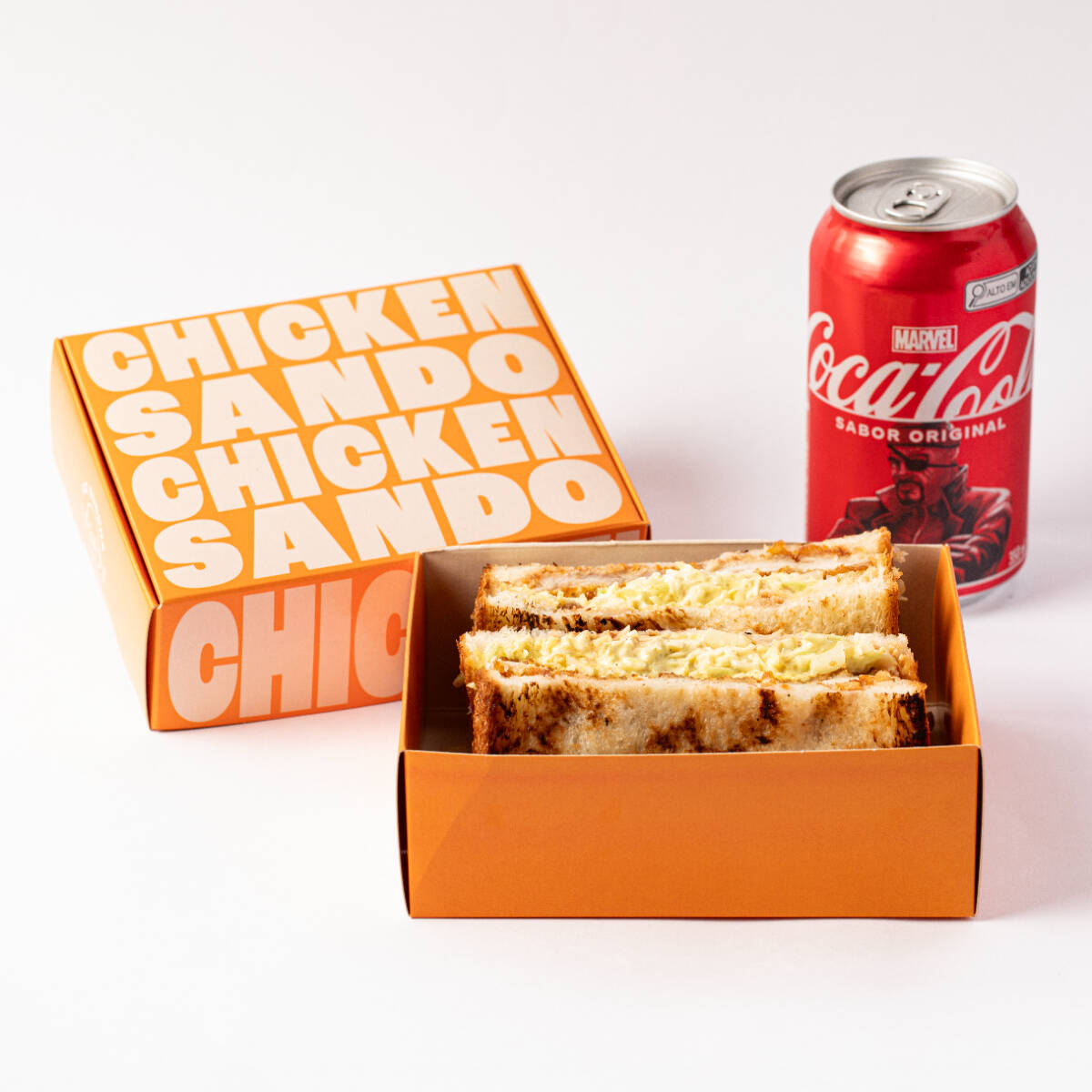 Chicken Sando + Coca Cola Tradicional sanduiche de frango, com molho tonkatsu, no pão Hokkaido (fermentação natural), saladinha de repolho com maionese de curry feita na casa e um toque de cebola finamente picada. Acompanha coca cola geladinha