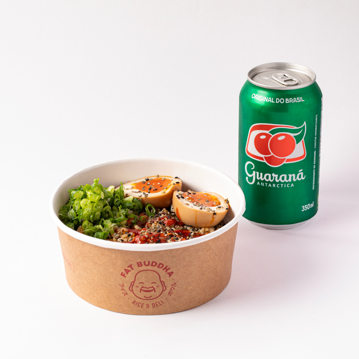 Guarana + Chicken Fried Rice Arroz frito (na wok) sobre coxa de frango, com cenoura e edamame. Finalizado com ovo ajitama (ovo cozido no ponto perfeito, marinado no shoyu e sake), cebolinha cortada bem fininha, cebola crispy e pimenta sriracha. Acompanha Guaraná geladinho.
