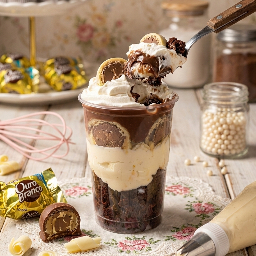 Nele, o brownie nobre na base é apenas o prelúdio do prazer. Nosso creme de Ninho escorre sensualmente entre pedaços generosos de Ouro Branco que estalam a cada colherada, enquanto o brigadeiro Nestlé envolve tudo com sua cremosidade intensa. Coroado com chantilly aveludado e um Ouro Branco inteiro no topo como um convite irrecusável.