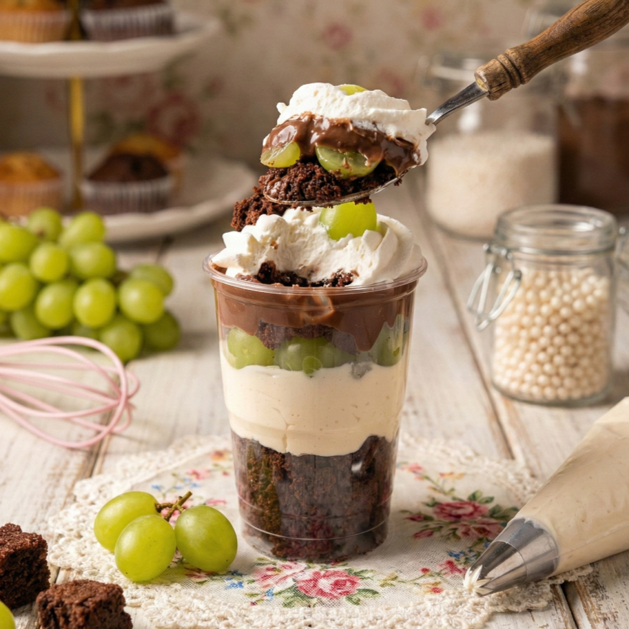 Sobremesa deliciosa que começa com um brownie macio na base, coberto por camadas irresistíveis de creme de Ninho. Uvas frescos em cada colherada trazem aquela acidez que equilibra a doçura, coberto com chantily aerado