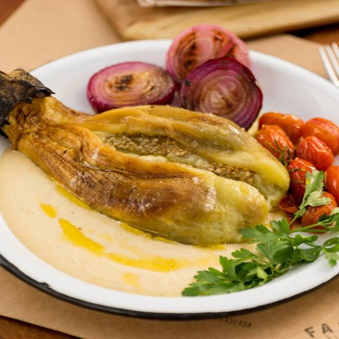Pasta de grão de bico com Tahine servido com berinjela assada na brasa, tomatinhos confitados, cebola roxa grelhada e um pão Pita.
