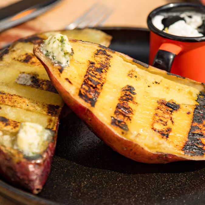 Batata doce assada e finalizada na brasa, servida com manteiga de ervas e sour cream.