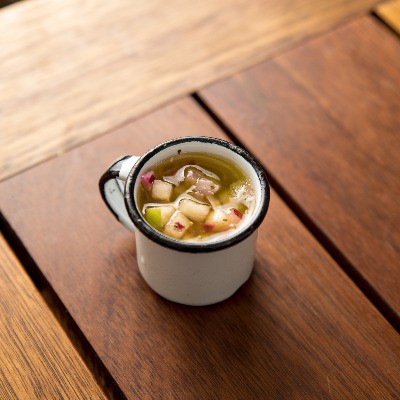 30g do nosso vinagrete de maçã verde, tomate verde, cebola roxa, pimenta dedo de moça e ervas frescas.