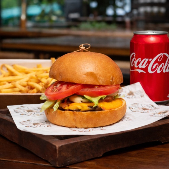 Burger da Fazenda: Pão brioche, nosso blend de burger de 180g e queijo cheddar inglês.