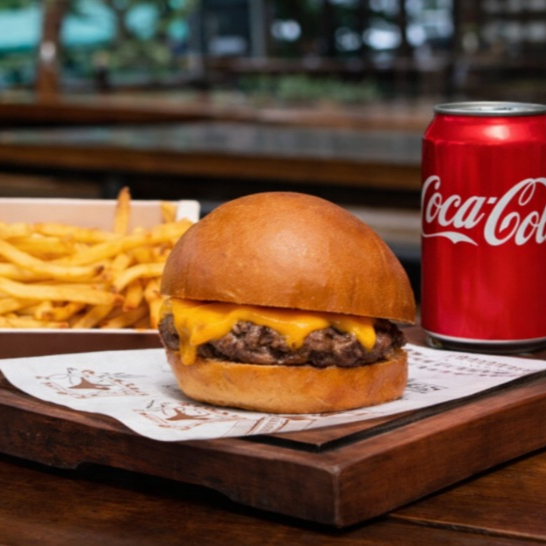 Burger de Wagyu (Pão brioche, nosso blend de burger de wagyu 180g e queijo cheddar) + Batata Frita + Bebida