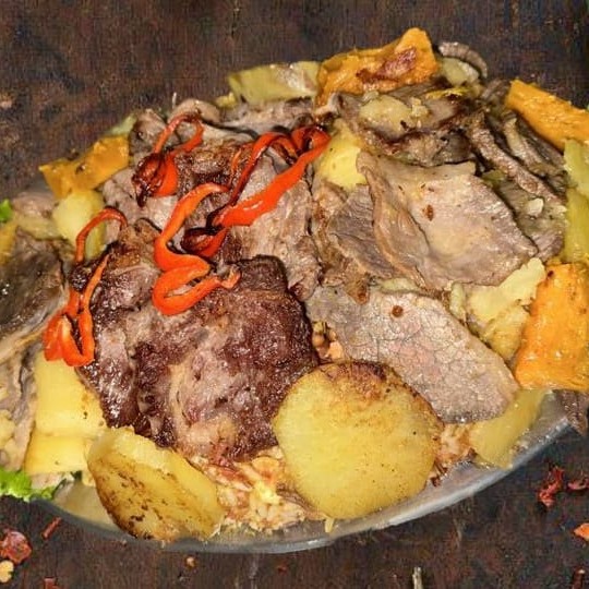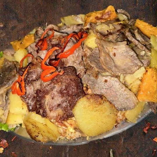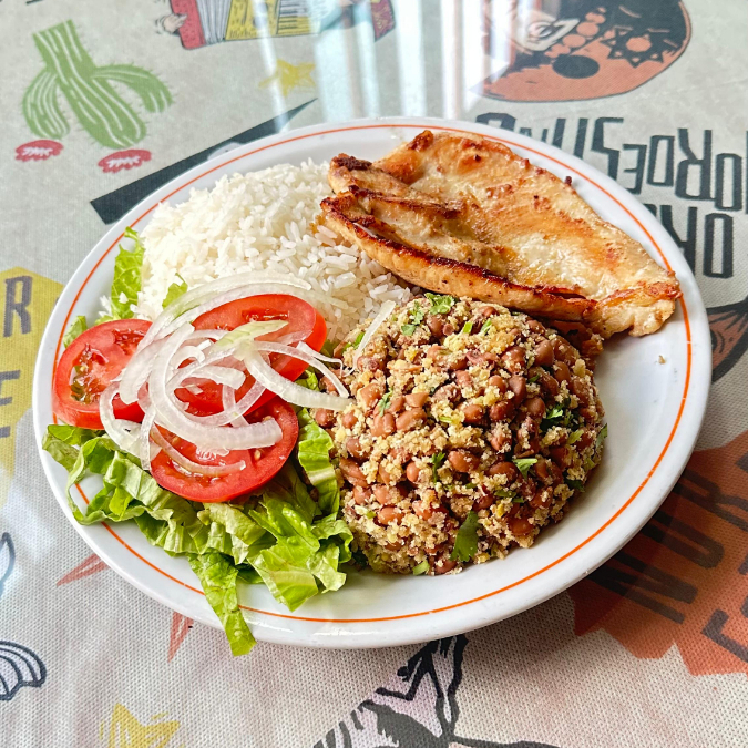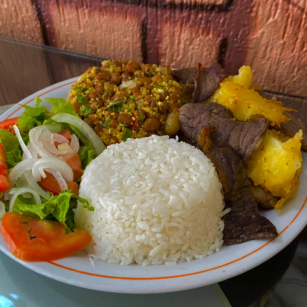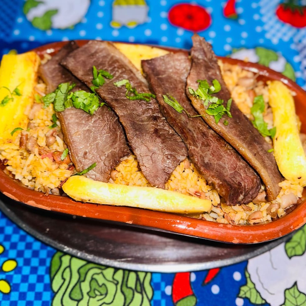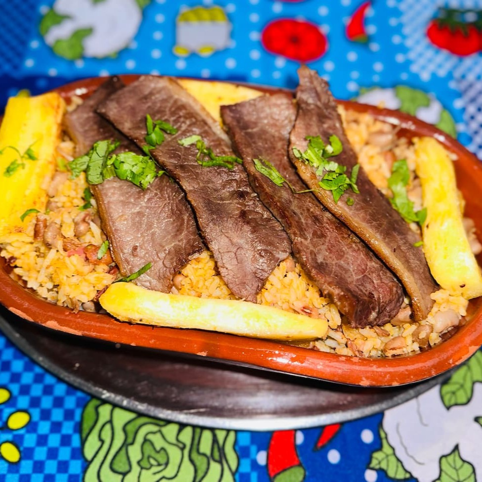 Arroz e feijão de corda mexidos com carne seca desfiada, cubinhos de queijo coalho e calabresa defumada. Acompanha contra filé e carne de sol com mandioca na manteiga.