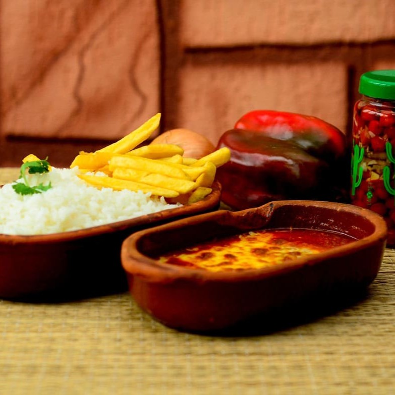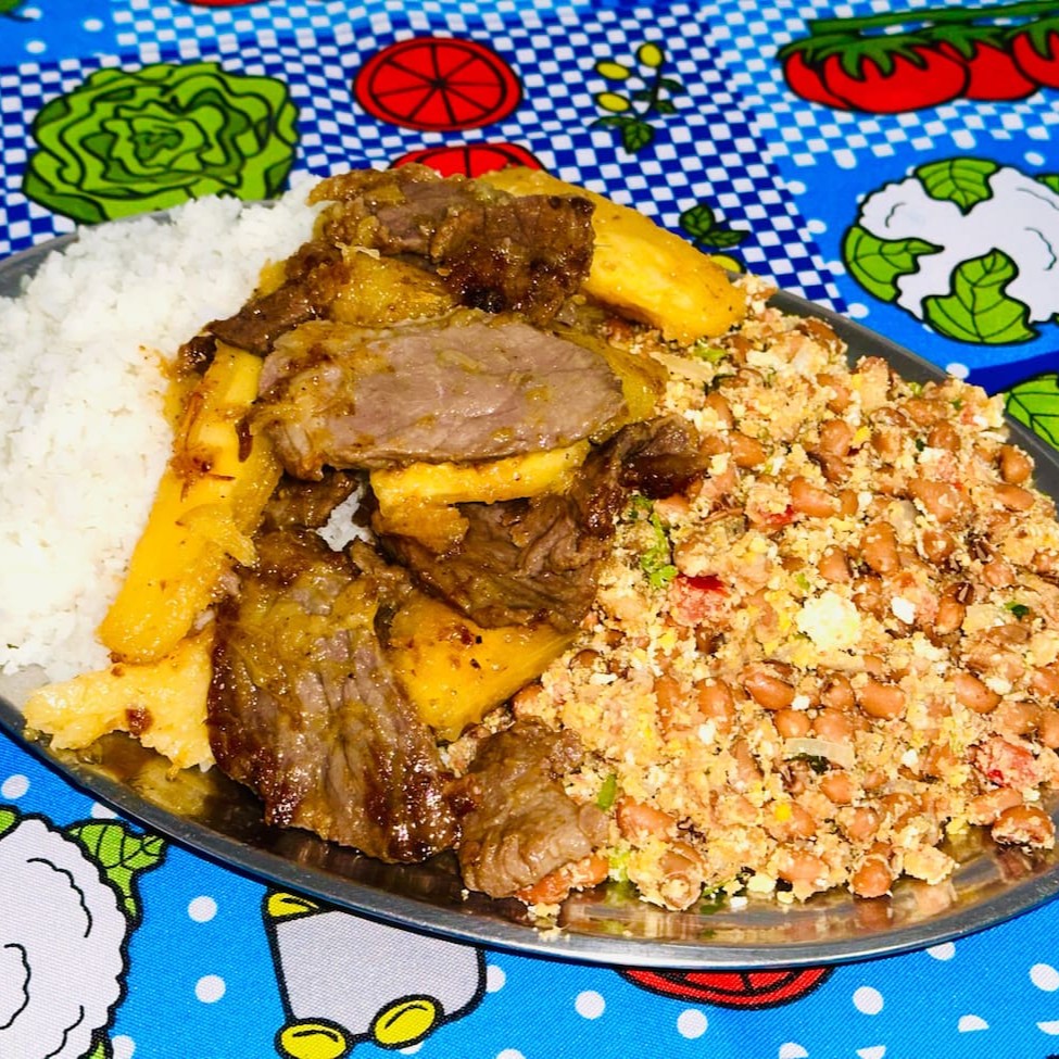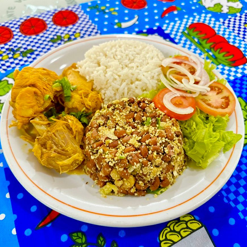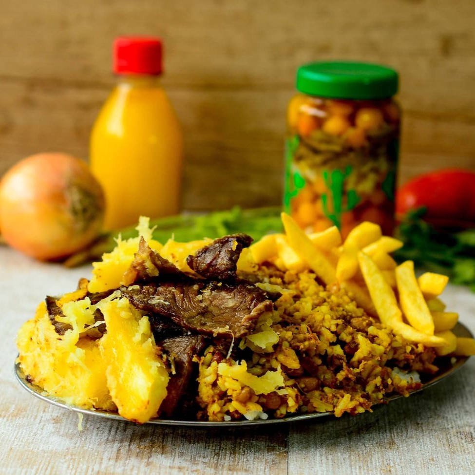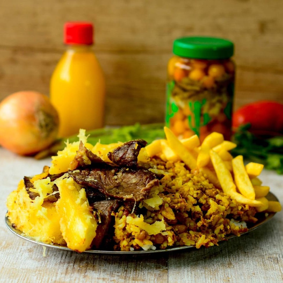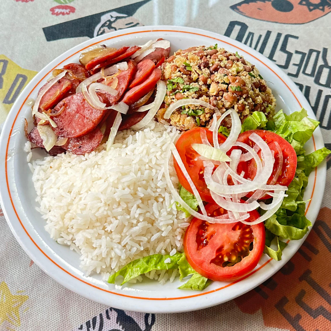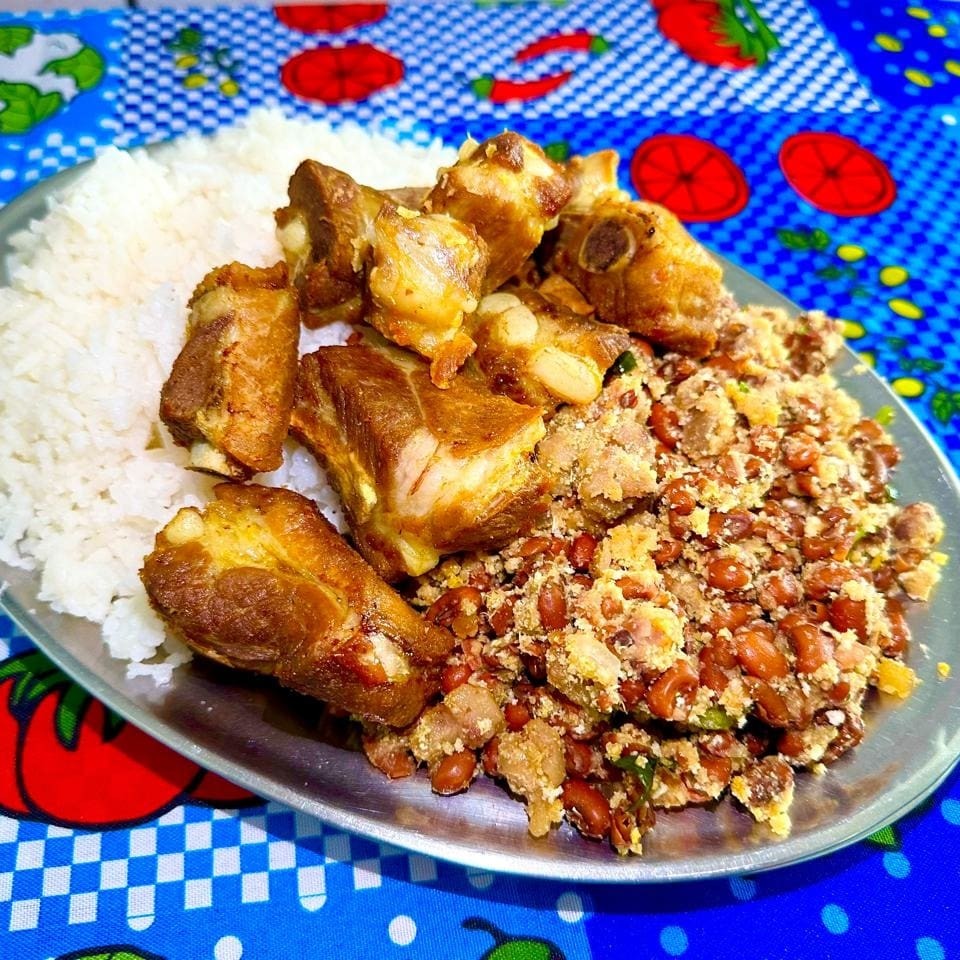 Arroz e feijão de corda mexidos com carne seca desfiada, cubinhos de queijo coalho e calabresa defumada. Acompanha carne de sol com mandioca na manteiga e batata frita.