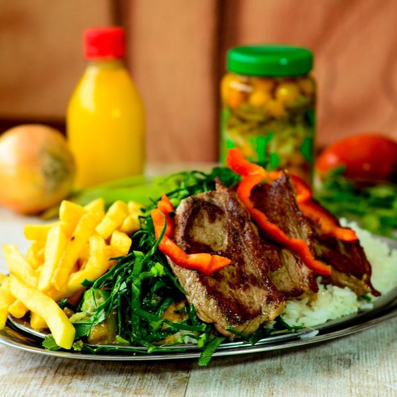 Picanha Grelhada,bem servida em fatias generosas, acompanha arroz branco, feijão de corda, couve na manteiga e batata frita.