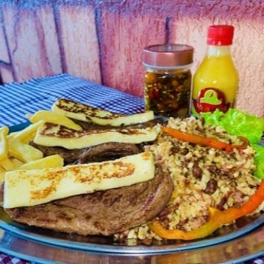 Deliciosa combinação de arroz, feijão de corda, calabresa em cubinhos, carne seca desfiada, puxado na manteiga, com fatias suculentas de picanha grelhada e queijo coalho assado, ah, acompanha fritas, huuum! (2 fatias de picanha)