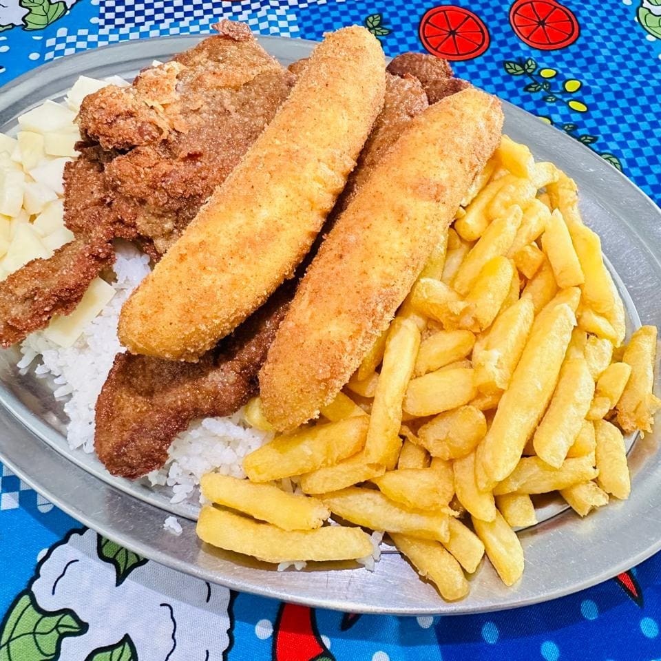 Bife de contra filet a milanesa. Acompanha arroz, fritas, palmito, ervilha e banana à milanesa.