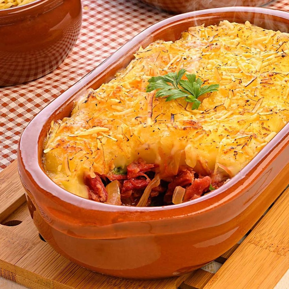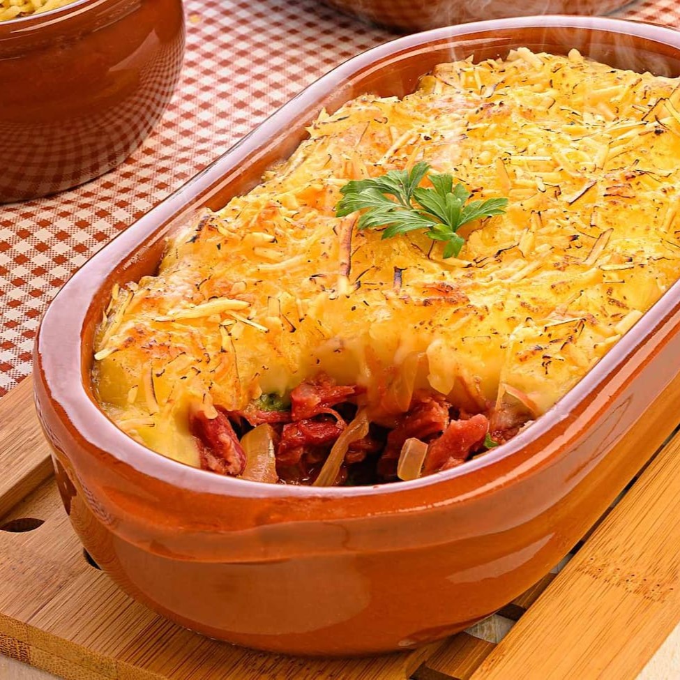 Carne seca desfiada, puxada na manteiga, coberta com purê de mandioca e mussarela e gratinada no forno. Acompanha APENAS arroz branco.
