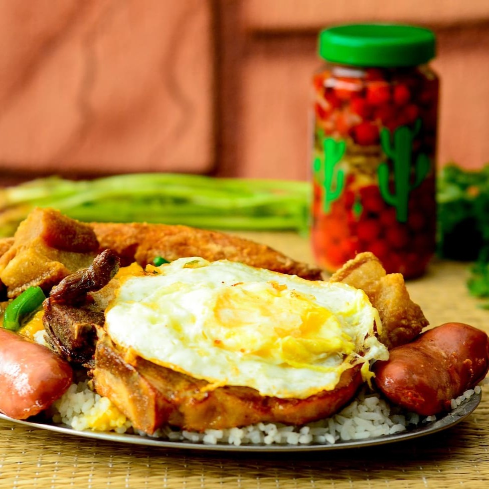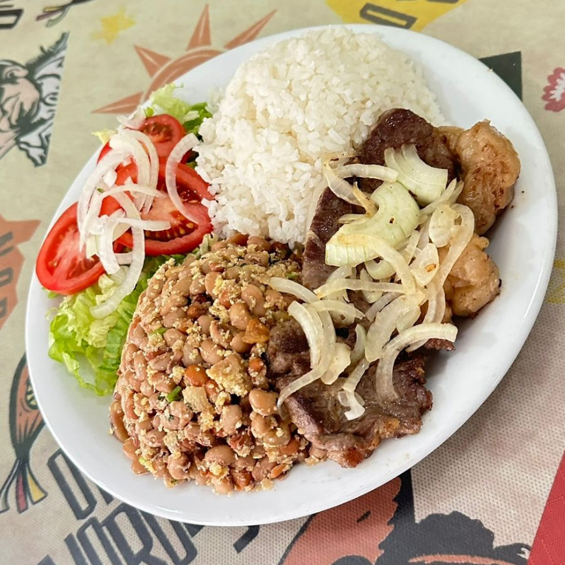 Acompanha bisteca, ovo frito, banana, torresmo, arroz e feijão de corda e couve na manteiga