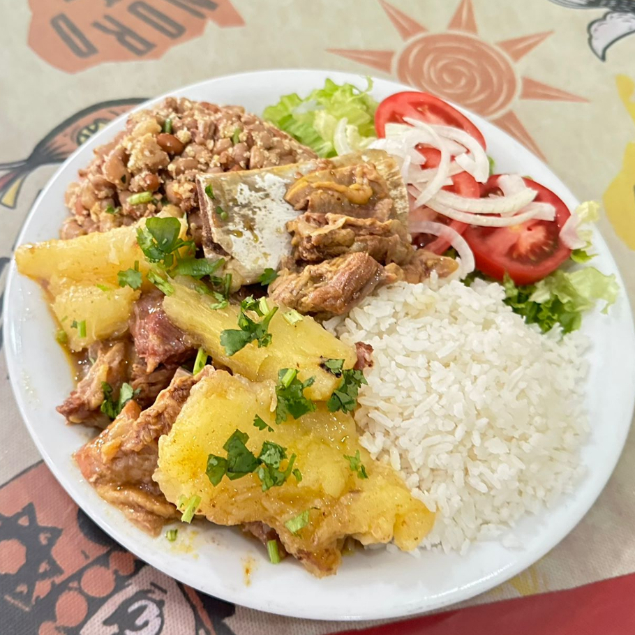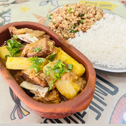 Costela cozida com mandioca. Acompanha arroz e feijão de corda. (Contém pedaços com e sem ossos)