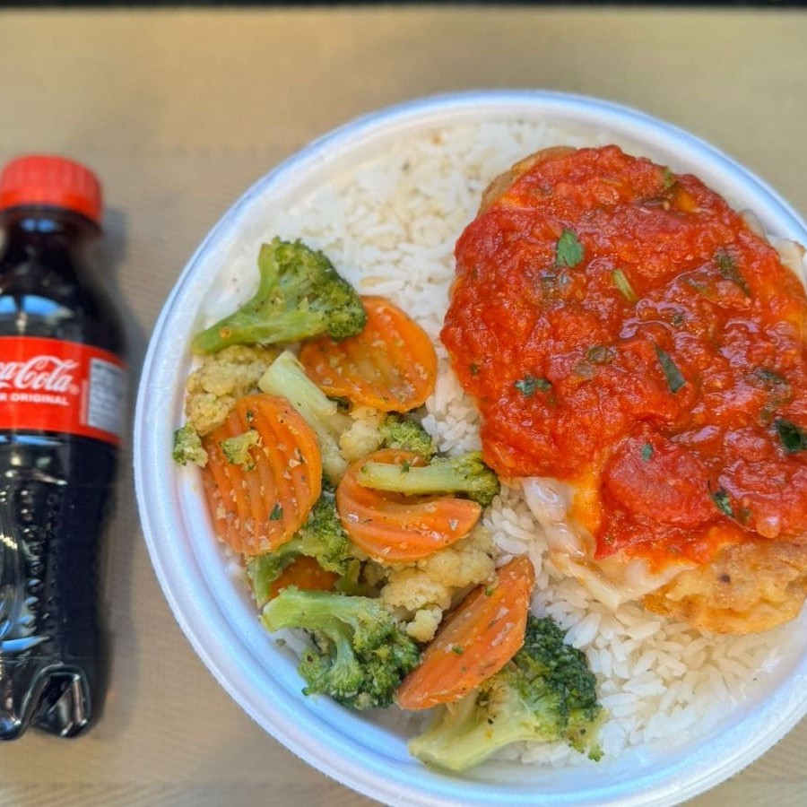 Marmita com delicioso filé de frango parmegiana (empanado na massa crocante coberto com molho de tomates e queijo) acompanhado de arroz branco e mix de legumes. Acompanha refrigerante Coca Cola lata Zero sem açúcar 350ml bem gelada. Marmita indicada para 01 pessoa.