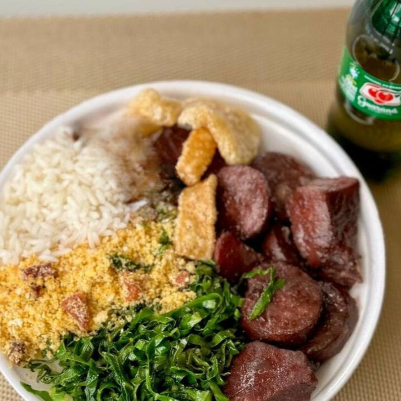 Feijoada Simples + Guaraná Pet + R$ 18,99 leve outra marmitex , Marmita feijoada magra individual (arroz, lombo, costelinha, linguiça calabresa, paio, couve refogado na manteiga, farofa e torresmo). Acompanha refrigerante pet Guaraná Antárctica bem gelado. Marmita indicada para 01 pessoa.