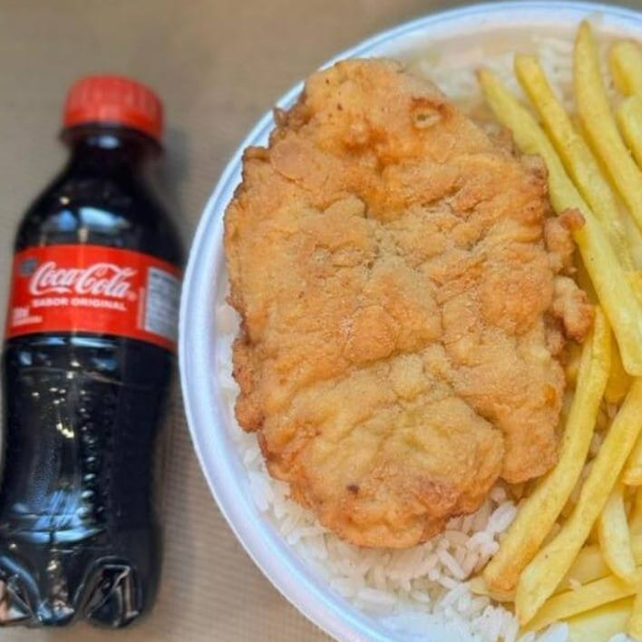 Frango Empanado & Fritas + Coca Pet + R$ 18,99 leve outra marmitex, Marmita com delicioso filé de frango empanado na massa crocante acompanhado de arroz branco, feijão e batatas fritas. Marmita indicada para 01 pessoa.