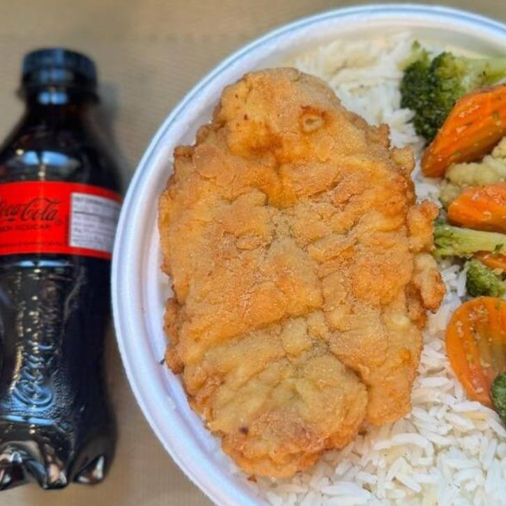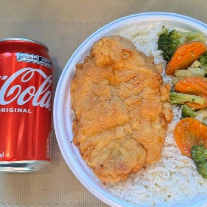 Frango Empanado & Legumes + lata Coca normal + R$ 14,99 leve outra marmita, Marmita com delicioso filé de frango empanado na massa crocante acompanhado de arroz branco, feijão e Mix de legumes. Marmita indicada para 01 pessoa.