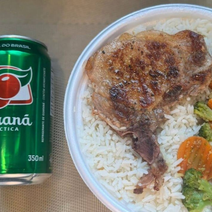 Bisteca & Legumes + lata Guaraná Antárctica + R$ 14,99 leve outra marmitex, Marmita com deliciosa bisteca suína preparada com arroz branco, feijão e mix de legumes. Marmita indicada para 01 pessoa.
