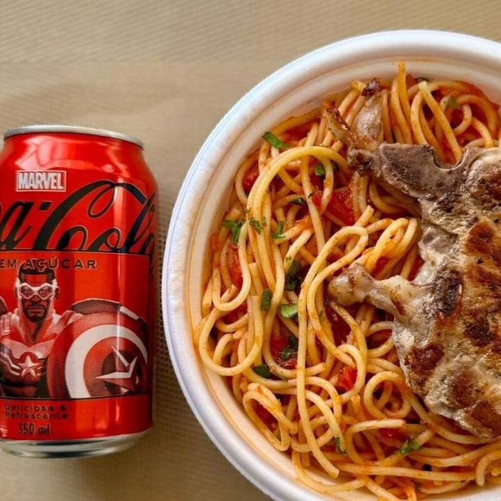 Espaguete & Bisteca Suína + lata Coca Zero + R$ 14,99 leve outra marmitex, Marmita com deliciosa bisteca suína grelhada acompanhada de macarrão espaguete ao molho de tomates. Marmita indicada para 01 pessoa..