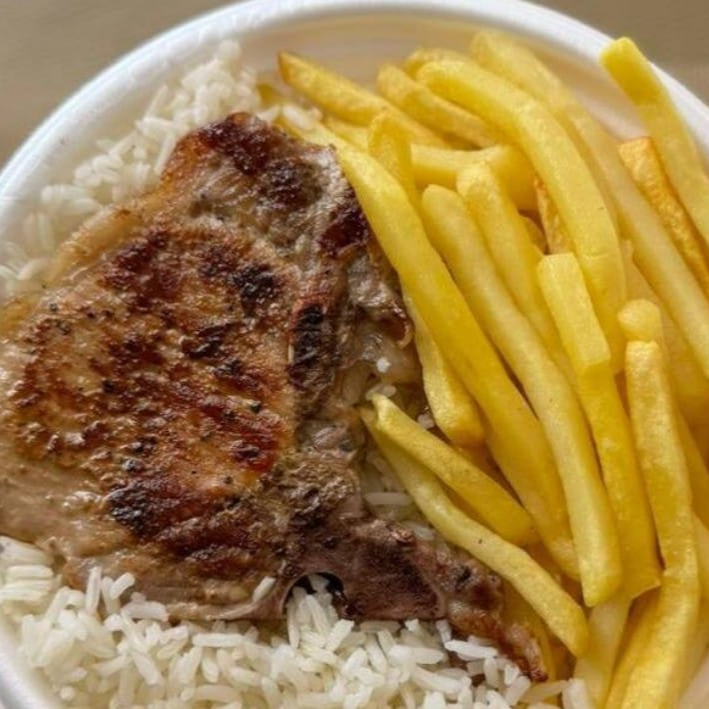 Bisteca & Fritas + R$ 18,99 leve outra marmitex , Acompanha , arroz branco, feijão carioca, bisteca e fritas