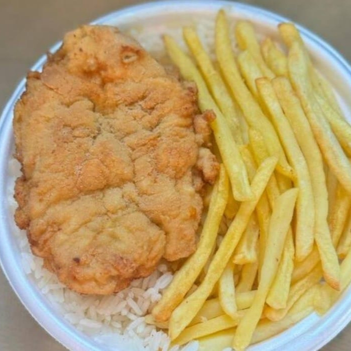 Frango Empanado & Fritas + R$ 18,99 leve outra marmitex, Marmita com delicioso filé de frango empanado na massa crocante acompanhado de arroz branco, feijão e batatas fritas. Marmita indicada para 01 pessoa.
