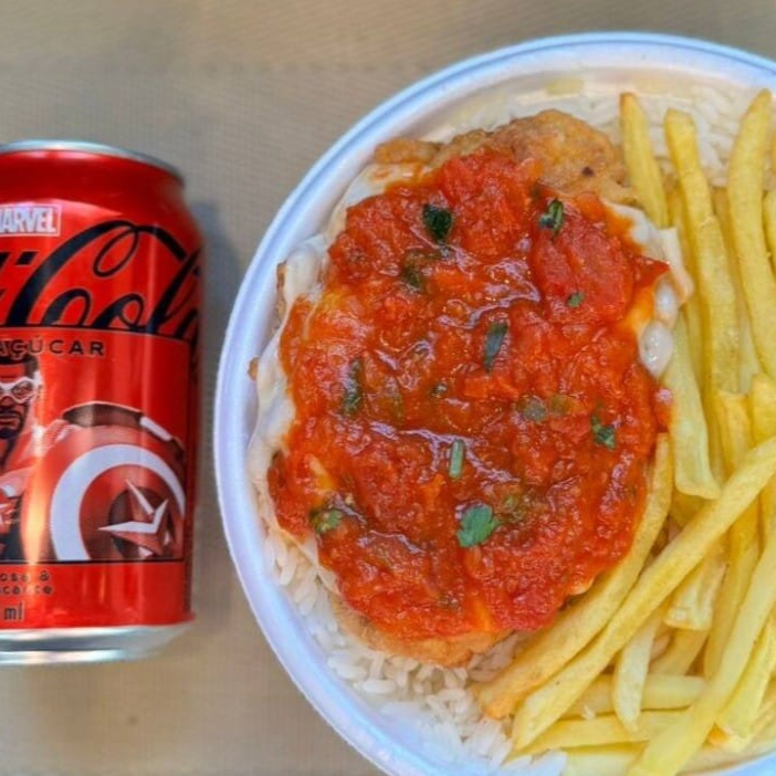 Frango Parmegiana & Fritas + lata Coca Zero + R$ 14,99 leve outra marmitex. Marmita com delicioso filé de frango parmegiana (empanado na massa crocante coberto com molho de tomates e queijo) acompanhado de arroz branco e batatas fritas. Marmita indicada para 01 pessoa.