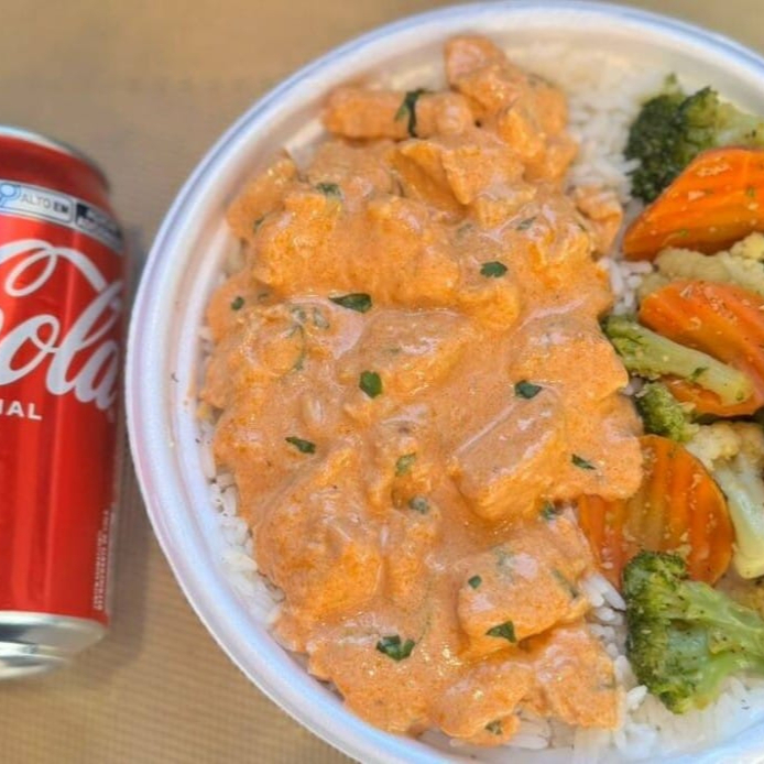 Strogonoff Frango & Legumes + lata Coca normal + R$ 14,99 leve outra marmitex, Marmita com delicioso filé de frango ao molho estrogonofe acompanhado de arroz branco e mix de legumes. Marmita indicada para 01 pessoa.