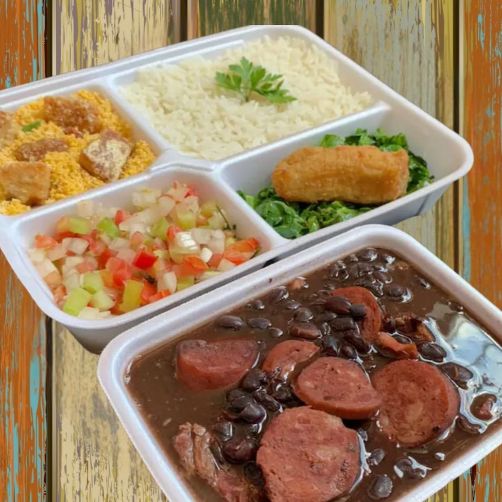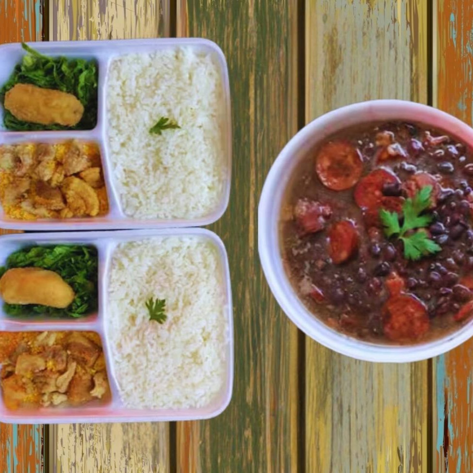 Feijoada magra: carne seca, lombinho fresco, costelinha suína, linguiça calabresa. Acompanhado de: arroz branco, couve refogada na manteiga, torresmo, banana empanada e deliciosa farofa do chef. (pote de 1l+2 bandejas) *foto ilustrativa*