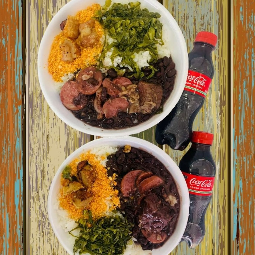 2 marmitas - Arroz, farofa, couva, torresmo e calabresa com as carnes magras da feijoada e ganhe 2 Cocas-Cola 220ml grátis.