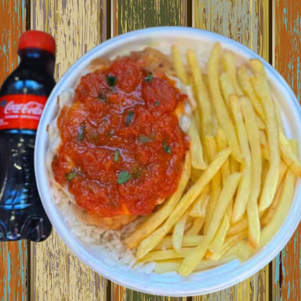 Marmita com delicioso filé de frango parmegiana (empanado na massa crocante coberto com molho de tomates e queijo) acompanhado de arroz branco e batatas fritas. Acompanha refrigerante pet Coca Cola bem gelado. Marmita indicada para 01 pessoa.