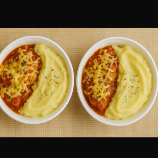 2 Parmegianas de frango ao molho sugo, acompanha arroz, feijão e purê de batatas.
