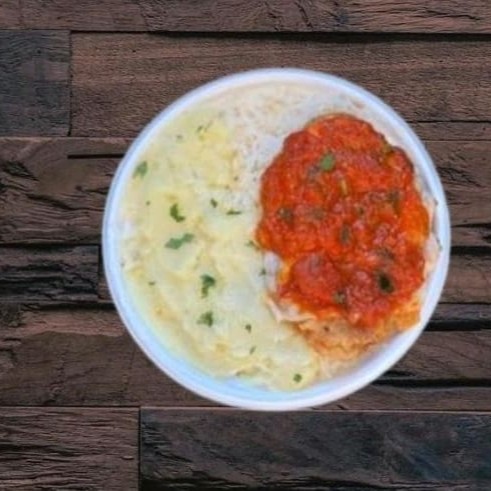 Marmita com delicioso filé de frango parmegiana (empanado na massa crocante coberto com molho de tomate e queijo). Acompanhado de arroz branco e purê de batata inglesa. Marmita indicada para 1 pessoa.
