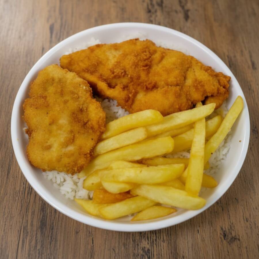 Filé de frango empanado arroz e fritas..