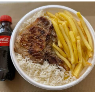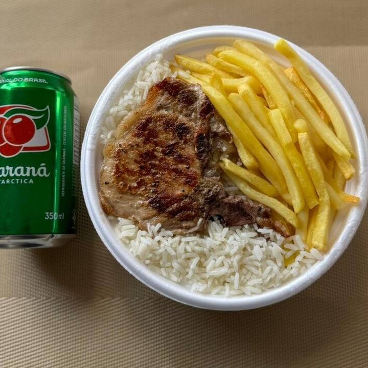 Marmita com deliciosa bisteca suína preparada com arroz branco, feijão e batatas fritas. Acompanha refrigerante pet Coca Cola bem gelado. Marmita indicada para 01 pessoa.