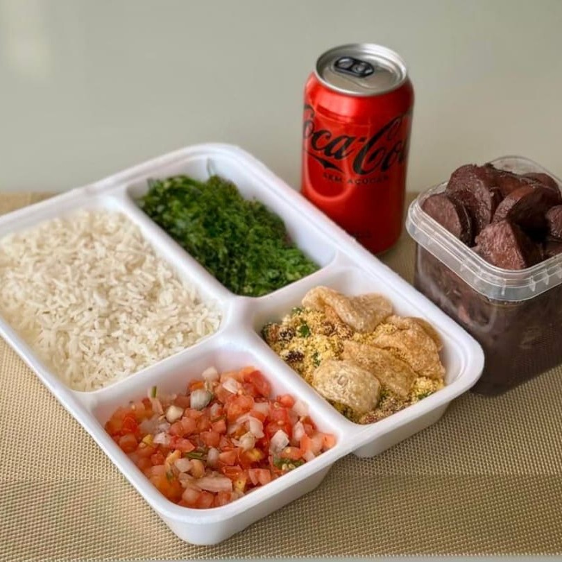 Marmita feijoada magra individual (arroz, carne seca, lombo, costelinha, linguiça calabresa, paio, couve refogado na manteiga, farofa e torresmo). Acompanha refrigerante Coca Cola lata Zero sem açúcar 350ml bem gelada. Marmita indicada para 01 pessoa.