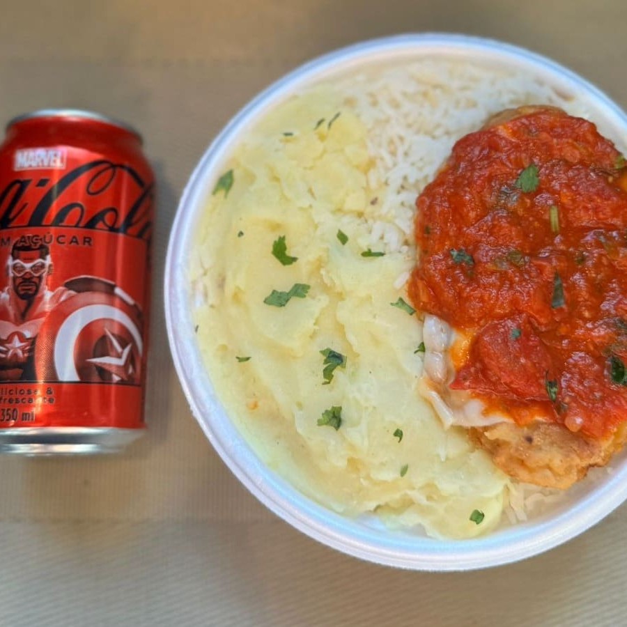 Marmita com delicioso filé de frango parmegiana (empanado na massa crocante coberto com molho de tomates e queijo) acompanhado de arroz branco e purê de batatas inglesas. Acompanha refrigerante Coca Cola lata Zero sem açúcar 350ml bem gelada. Marmita indicada para 01 pessoa.