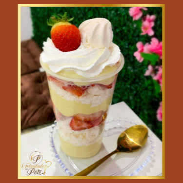 Copo da Felicidade - Merengue de Morango (250ml) – Sobremesa leve e cremosa com camadas de creme de leite Ninho, suspiros crocantes, creme de Laka, morangos frescos e finalização com chantilly aerado. Uma combinação suave e equilibrada, perfeita para quem ama contraste entre cremoso e crocante. Todos os produtos são preparados conforme descrito, mantendo qualidade e padronização. Agradecemos sua compreensão.