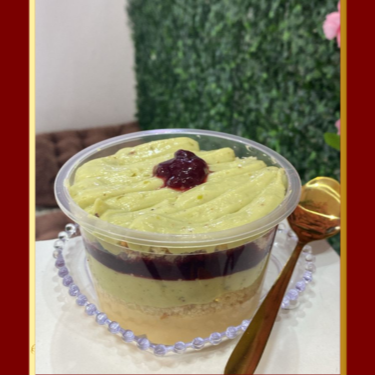 Bolo no Pote Pistache & Frutas Vermelhas (200ml) – Sobremesa sofisticada com camadas de bolo branco fofinho, brigadeiro cremoso de pistache, creme de leite Ninho e geleia caseira de frutas vermelhas. Finalizado com mousse leve de Ninho e raspas de chocolate, oferece o equilíbrio perfeito entre o doce e o azedinho. Uma explosão de sabor a cada colherada! Todos os produtos são preparados conforme des