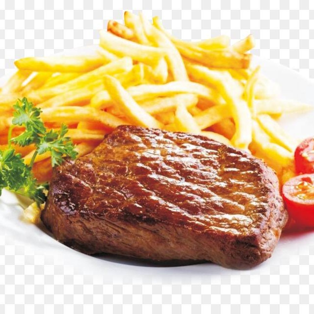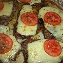 Contra file grelhado, coberto com mussarela derretida, tomate e oregano. Acompanha arroz e fritas