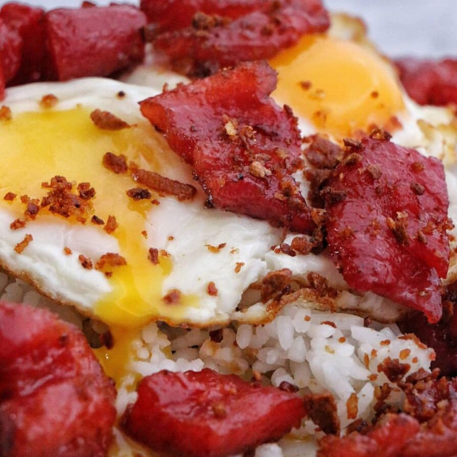 Panceta agridoce, arroz de alho, ovo frito e salada