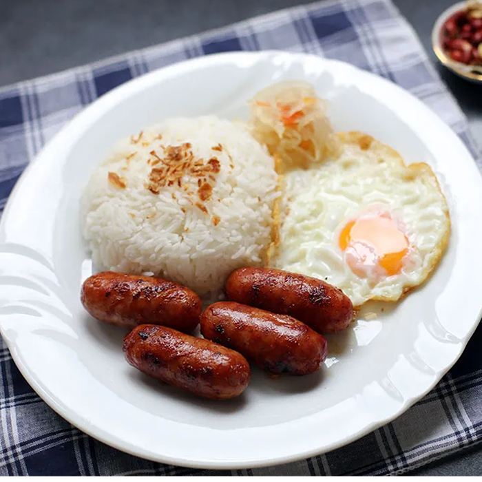 Lingui;a agridoce, arroz de alho, ovo frito e salada