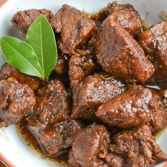 Clássico Filipino: carne macia cozida em molho de soja , vinagre, alho e especiarias.