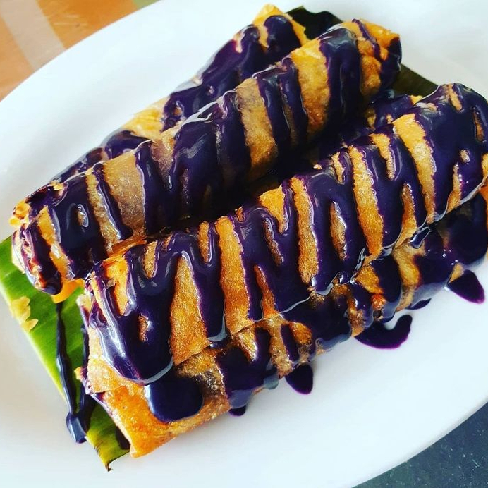 Ube Turon é uma sobremesa popular das Filipinas feita enrolando um recheio de ube (inhame roxo)