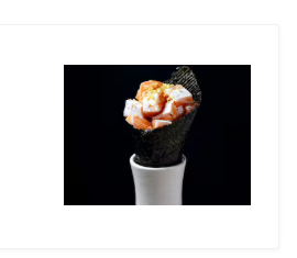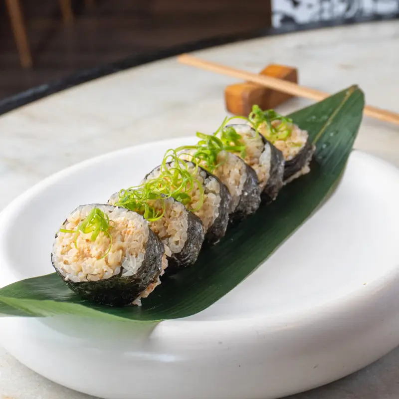 Enrolado com a alga por fora, recheado com carangueijo e mayo apimentada