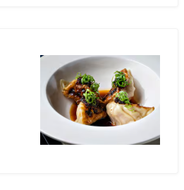Gyoza de rabo bovino, denver wagyu fatiado, alho torrado e molho roti