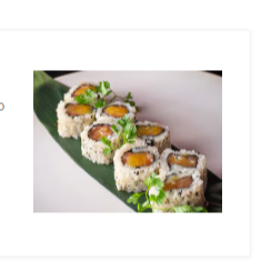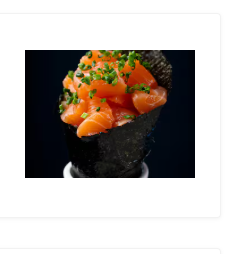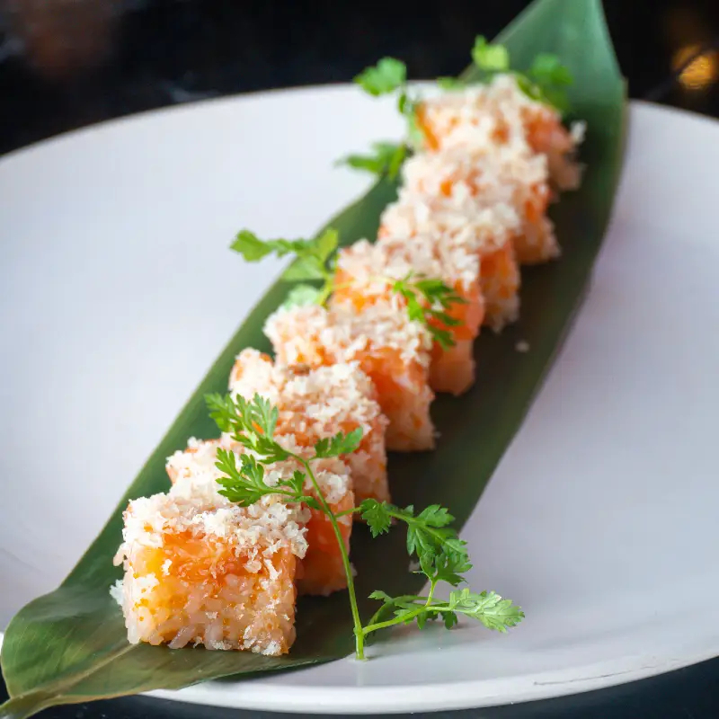 Enrolado com arroz por fora, recheado com salmão e finalizado com manteiga de katsuobushi