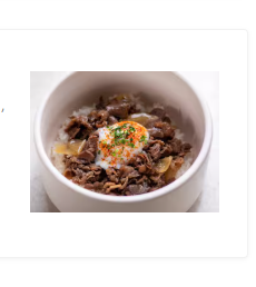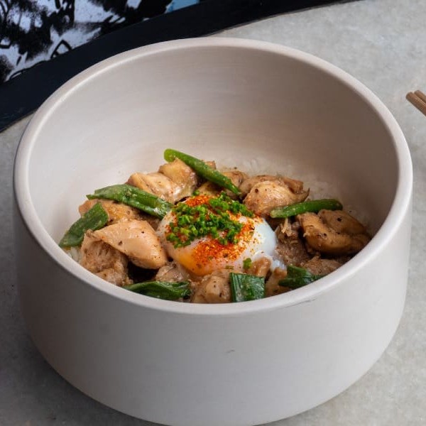 Finas lâminas carne bovina salteadas em caldo agridoce, gohan, onsen tamago, cebola caramelizada