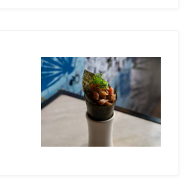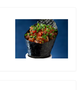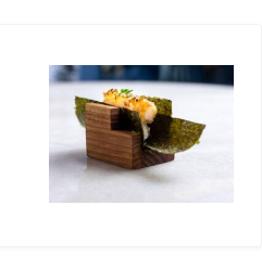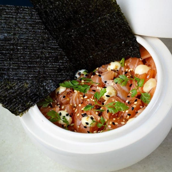 Alga nori, shari, salmão em cubos e manteiga de katsuobushi